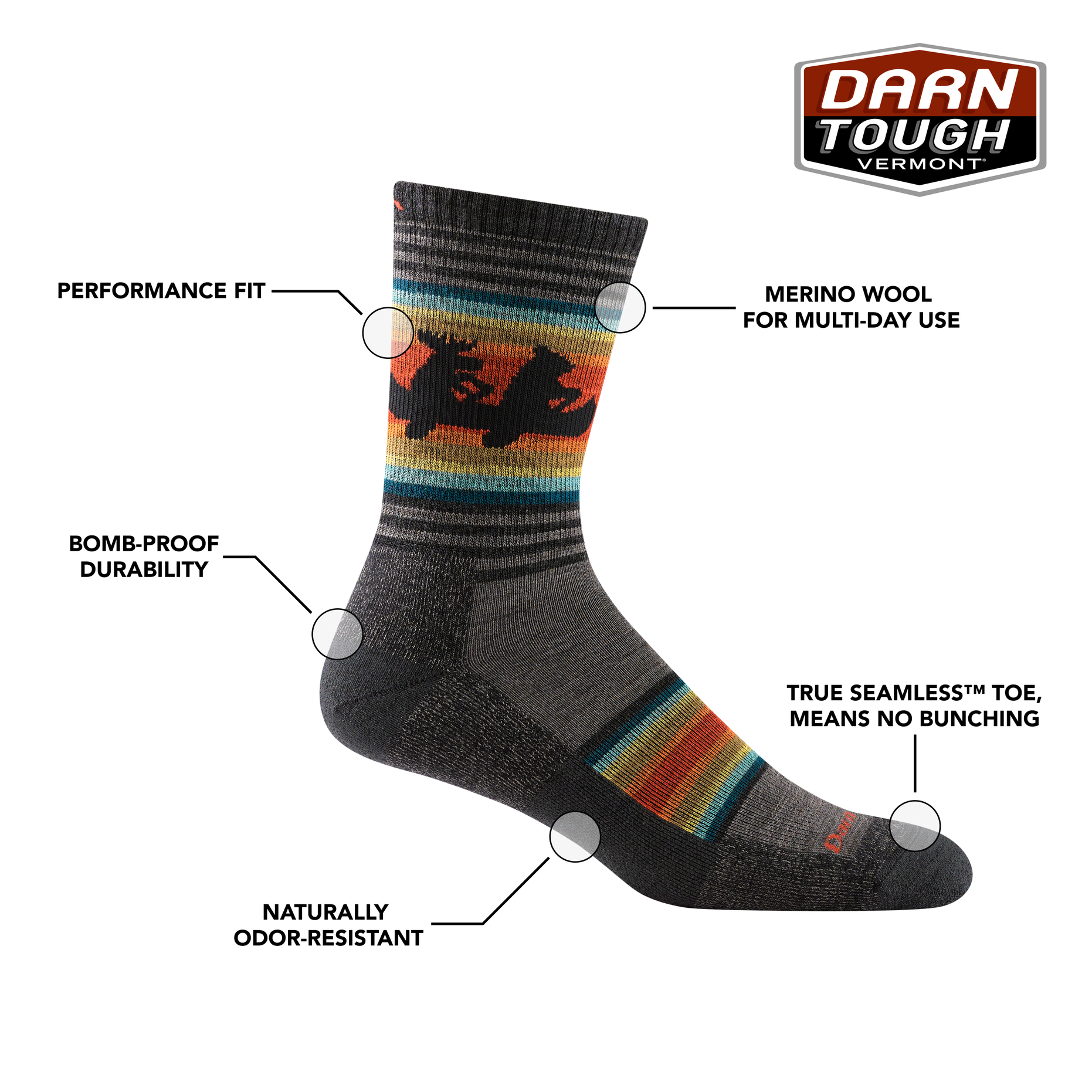 A performance fit means no slipping, no bunching, no blisters for maximum hiking comfort. Every toe seam is sealed with Darn Tough's True Seamless™ Toe technology for an ultra-smooth, discoverable feel.
