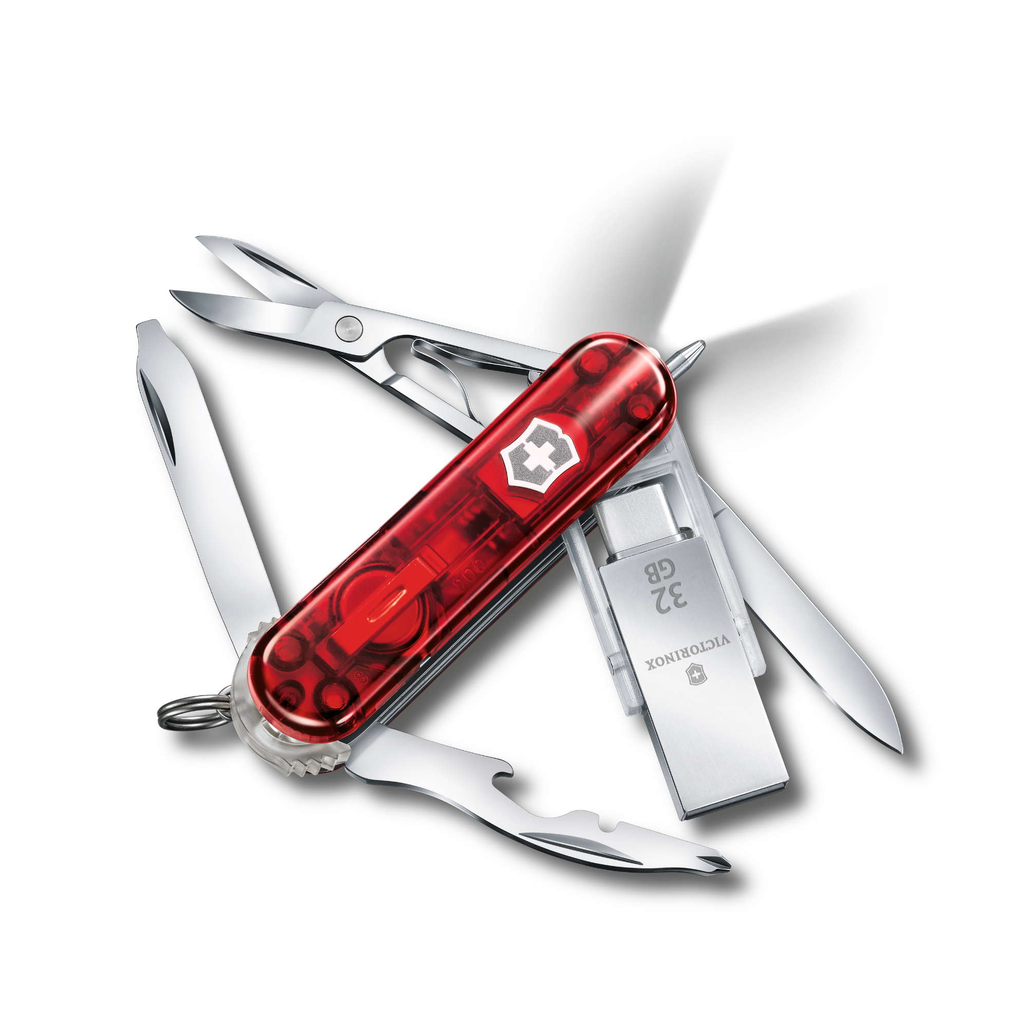 - Lille klinge / Flaskeåbner | Afisoleringstang | Stjerneskruetrækker 0/1, magnetisk / Saks / Neglefil | Skruetrækker 2,5 mm / LED / Nøglering / Trykkuglepen / USB-flashdrev 3.0 / USB-flashdrev 32 GB / Neglefil / Flaskeåbner